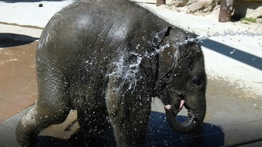 Saat Uthai menggunakan hidungnya untuk menyemprotkan lumpur ke seluruh tubuhnya, Arun duduk dan berguling-guling di genangan air. Keduanya telah menyelesaikan "masker lumpur" mereka. Perilaku ini dipercaya dapat melindungi kulit mereka dari sinar matahari dan mengusir serangga.