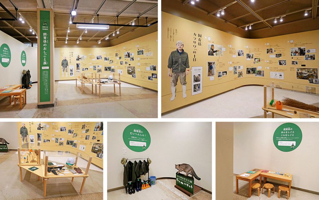 写真と解説で飼育係のしごとをわかりやすく解説。飼育係がつかう道具も展示。飼育係に「変身」できるコーナーもあります。