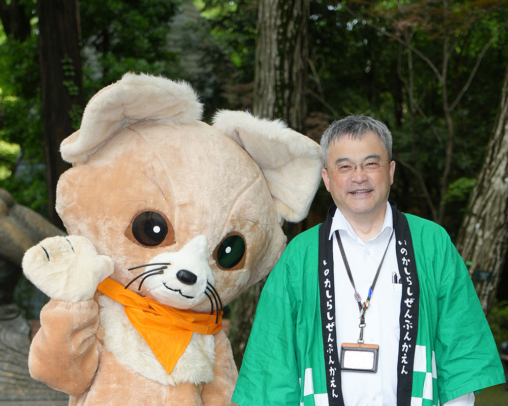 ご来園いただいたみなさまを、園長とフェネックの着ぐるみがお出迎えします。