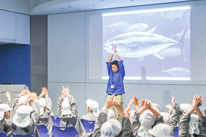 マグロはどんな魚かな? 広い海を泳ぎ続けてくらしているマグロの体のつくりや泳ぎを映像で見たり、まねっこをしたりしながら、マグロに親しみます。