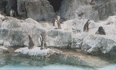葛西のフンボルトペンギンの魅力は、その元気のよさにあります。今(2001年12月現在)は残念ながらプールが工事中ですが、そうでなければ、プールの中が見られるようになっているので、ぜひそこを見てみてください。アクリル板越しに指か何かを見せてちらちら動かすと、ペンギンたちはそこに注目します。ひゅっと潜ってすごい速さで泳いでいたのに、きゅっと止まってそこを振り返るのです。指を動かすとそれに合わせて顔を動かします。その姿はさながら「泳げる猫」といった感じです。