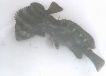そう、魚の体色や模様は、四六時中ずっと同じというわけではありません。人間の顔色と同じように、体調や環境によって変わるものなのです。例えば、釣りをしていて、釣り上げた後バケツに入れた魚の体の模様が変わったような気がしたことはありませんか?それはきっと、釣られてバケツに入れられ、魚にストレスがかかっている印です。写真では、黄色と黒のしま模様のイシダイが、釣られた後はなんだか黒ずんだ色になってしまっています。もっと広いところに移し替えてやるとか、仲間を入れてやるなどすると、また元の模様に近づくことと思います。 |