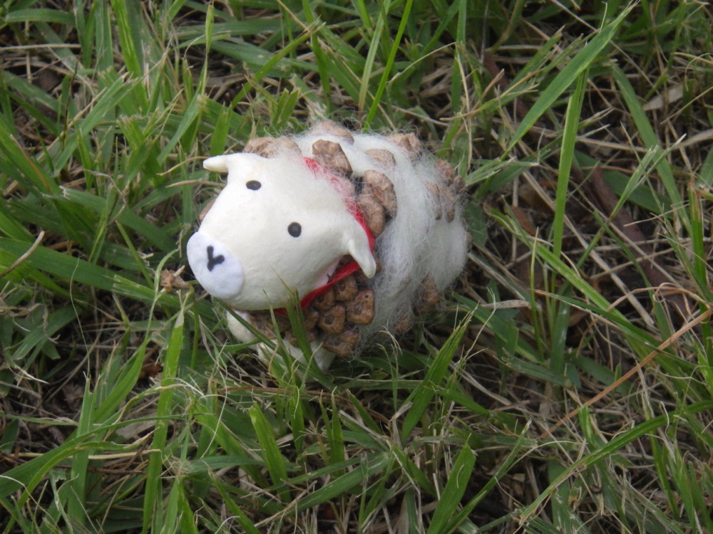 井の頭自然文化園で飼育している2頭のヒツジ(「ベル」と「アリス」)の毛と松ぼっくりを使って、ヒツジの置物を作ってみませんか?