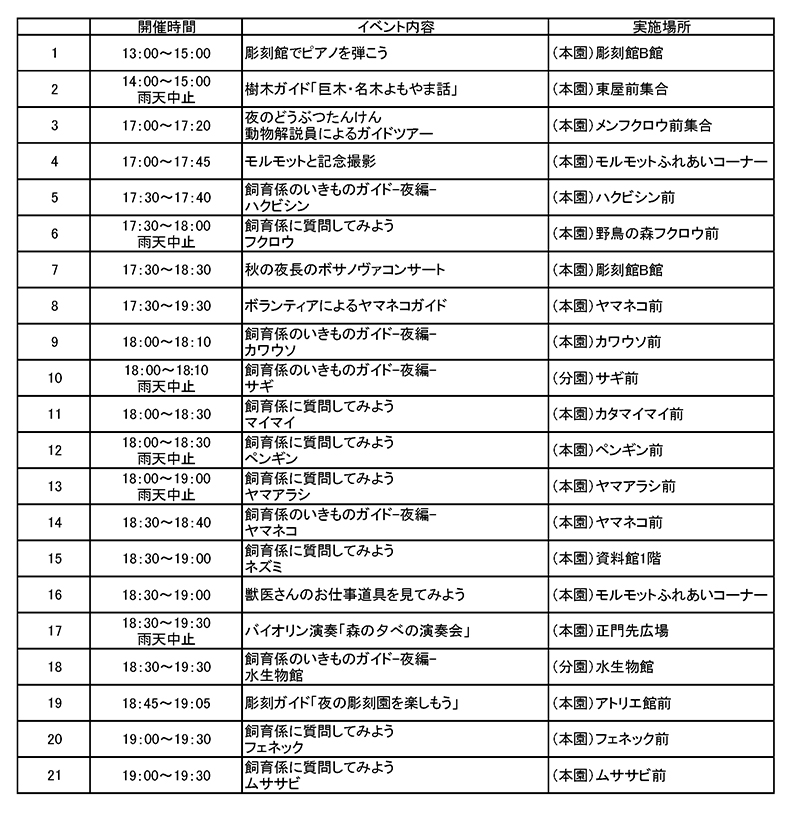 井の頭自然文化園では、秋の開園3時間延長「ちょっとおでかけ 秋の夜長の自然文化園」を開催します。