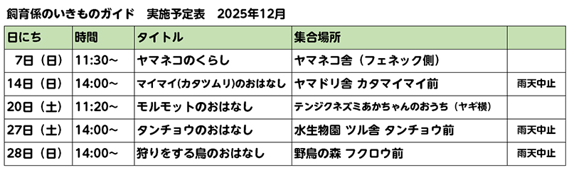 ※動物の体調管理などの都合により、予告なく中止や変更をする場合がありますので、ご了承ください。