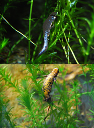 この時期、イモリのオスの尾には、ちょっとした変化が見られます。尾の部分が鮮やかな青白い色に変化し、うっすら白と黒の縞もようが見えるようになります。そしてオスはメスのあとを付けまわし、メスが立ち止まるとその前にまわってS字に曲げた尾を一生懸命震わせるのです。