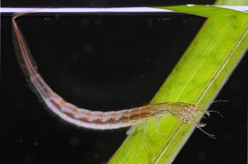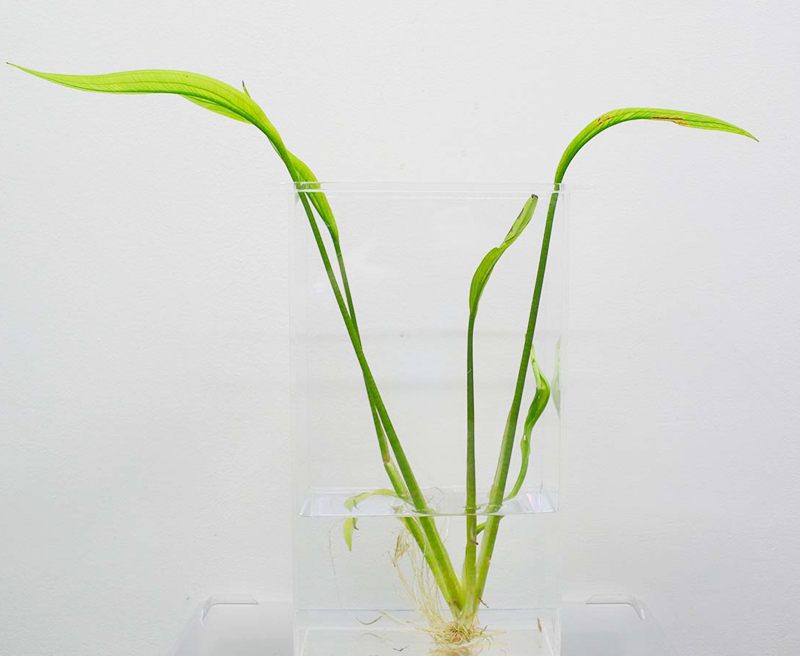 初回は卵から幼虫が生まれる「孵化」(ふか)のようすをご紹介します。ゲンゴロウは水辺に生える植物の内部、スポンジ状になった部分に卵を産みつけます。水生物館ではヘラオモダカという水草を使っています。