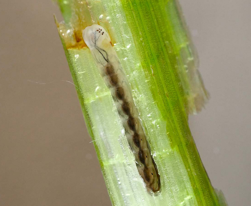 産みつけられた卵は2週間ほどで孵化し、親が産卵のために開けた穴から体長25ミリくらいの細長い幼虫が現れます。多く産みつけられたヘラオモダカからは一晩で何匹もの幼虫が孵化しますが、そのままにしておくと幼虫たちは共食いを始めてしまいます。見つけた幼虫は1匹ずつ小さな容器に移して育てます。