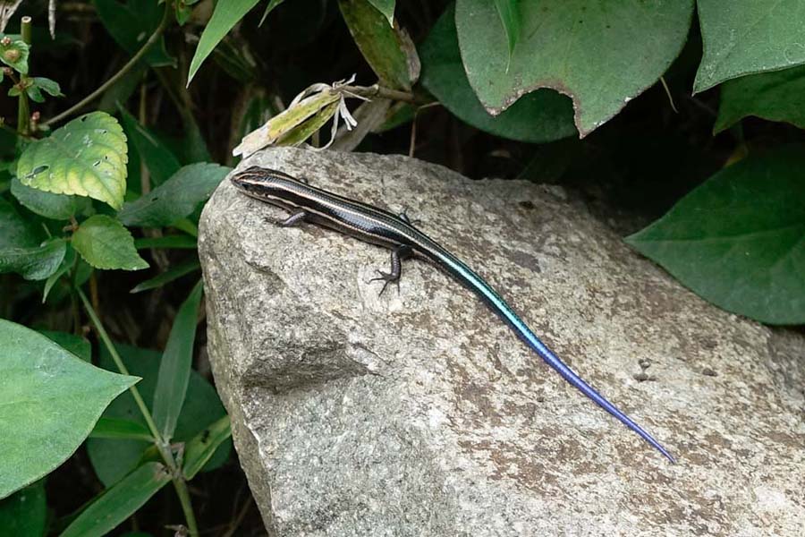 鮮やかな青い尾が目立つヒガシニホントカゲの幼体