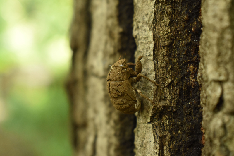 広場内ではさまざまなセミの抜け殻が見られます。木のあたりだけでなく、葉っぱの上や池の周りでも探してみてください。写真はニイニイゼミの抜け殻です。
