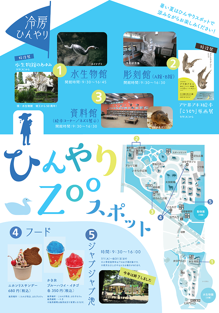 井の頭自然文化園では、暑い夏の園内を少しでも快適に過ごしていただき、さらに熱中症予防にも役立てていただくため、園内でひと涼みできる場所を「ひんやりZOOスポット」として紹介しています!