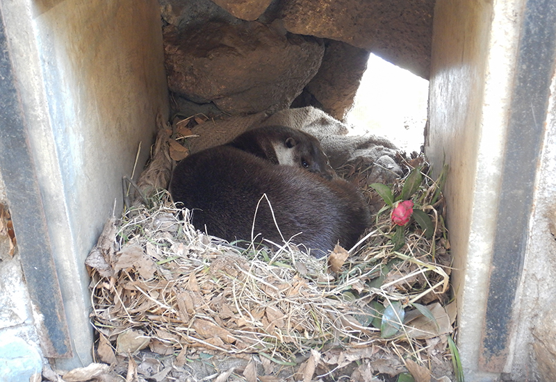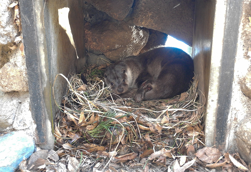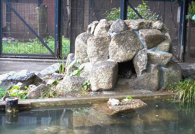 井の頭自然文化園のユーラシアカワウソの展示場では、岩組みの巣穴と木製の巣箱を休息場として設置しており、カワウソはこの2か所をおもな休息場として使っています。