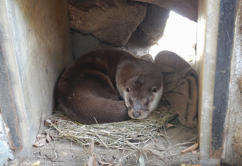 | 左側に木製の巣箱、右側に岩組みの巣穴がある展示場 | 現在飼育しているユーラシアカワウソのメス |