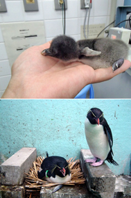 暑さに弱いイワトビペンギンは、春から秋口にかけてみなさんからごらんいただけない冷房室で過ごしています。イワトビペンギンは冷房室で繁殖期を迎えており、2013年は1羽のひなが誕生しました。今回はそのようすをご紹介します。