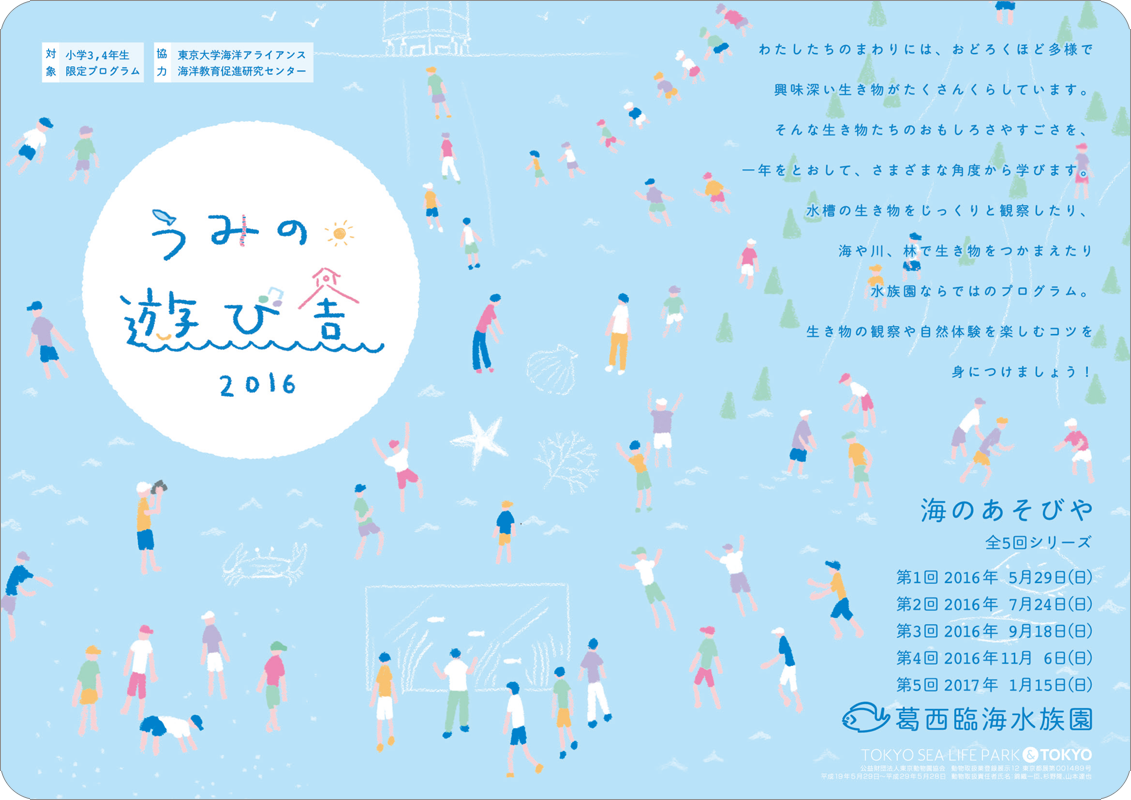 2016年度は年5回。水族園の水槽で生きものをじっくりと観察したり、海や川で生きものをつかまえたり、水族園ならではのプログラムで、生きものや自然の楽しみ方を知ることができます。