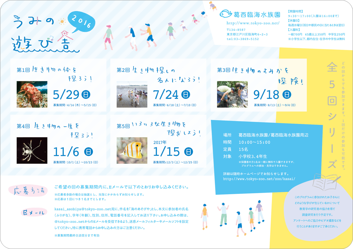 kasai_asobiya@tokyo-zoo.net 宛に、件名を「海のあそびや」とし、本文に参加者の氏名(ふりがな)・学年(年齢)・性別・住所・電話番号を記入してお送りください。