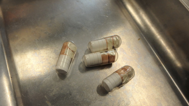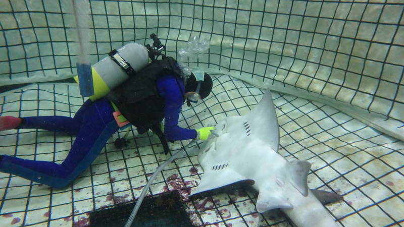 | 錠剤をまとめたカプセル | シノノメサカタザメに麻酔をかけて 治療するようす |