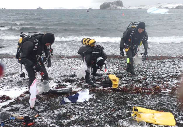 翌日、さっそく潜水採集をおこないました。われわれは低温に耐える潜水用のドライスーツを身にまとい、海に入りました。水に顔をつけた瞬間、顔中が痺れ、こめかみのあたりに痛みが走ります。それもそのはずで、水温は 0.9℃しかありませんでした。