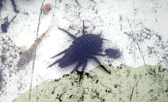 水深10メートルまで進むと、砂地の海底のところどころにパッチ状の海藻が見えます。そっと海藻をどかすと、巨大な等脚類「グリプトノートゥスアンタルクティクス」が海底の砂に頭を突き刺していました。大きさは体長10センチほどで、発達した脚をもつ、なかなか見ごたえのある生き物です。