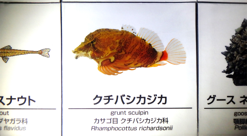 クチバシカジカは北太平洋沿岸部に生息する全長8センチほどの小さな魚で、胸びれを使って歩くように移動する姿が印象的です。ラベルの写真を見ると、体の半分もある大きな頭がゴツゴツとしていて、まるで岩のように見えませんか? そこで岩そっくりなジャイアントエイコーンバーナクルに注目してみましょう。もしかしたら隠れているかもしれません。