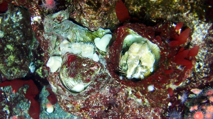 いました! 殻の中からひょっこりと顔を出しています。生きているジャイアントエイコーンバーナクルに色や形がなんとなく似ていると思いませんか? まわりの環境に色や形が似ているため、カモフラージュになる種がいます。いわゆる「擬態」です。じつはクチバシカジカは、フジツボへの擬態によって身を隠していると考えられます。
