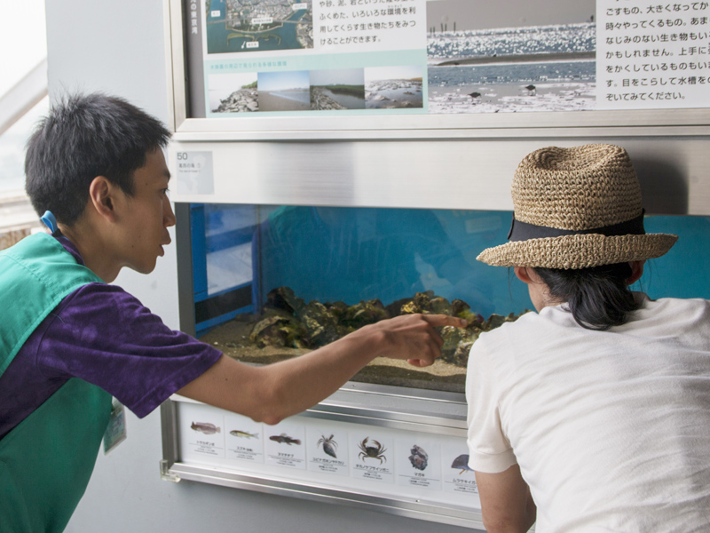 葛西臨海水族園では、水槽の前で生き物についてのガイドやイベントの補助などの活動をするボランティア