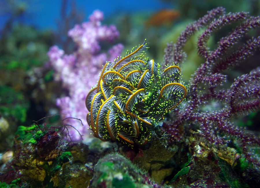 現在水槽ではニッポンウミシダとシモフリウミシダがよく観察できます。ニッポンウミシダはさまざまな色のバリエーションがありますが、多くはオレンジと黒色の腕に先端が黄色といったカラフルな色をしています。水中を漂うエサを捕えるため、潮の流れがよい場所を好み、水槽でも水流がよくあたる岩の隙間から腕を伸ばしている姿がよく見られます。