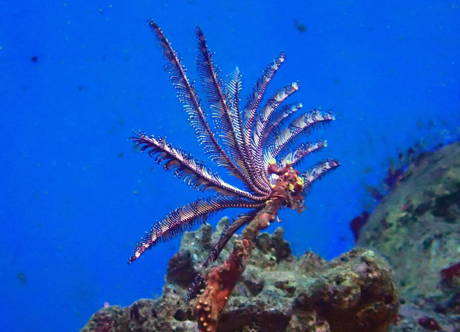 シモフリウミシダは斑模様がある小型のウミシダで、潮の流れがよく、えさを捕まえやすい場所を求めて、腕を使って泳いで移動することもあります。刺胞動物のヤギのなかまの先端にしがみついていることも多く、水槽内でもそのようすを観察することができます。ヤギのなかまの先端で腕を広げているシモフリウミシダの姿は、水中に咲いた花のようにも見えます。