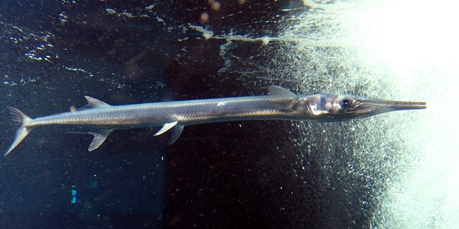 擬岩側では現在、6種の魚が生活をしています。その中でひときわ細い体をしているのが今回の主人公、世界中の熱帯から温帯に広く分布し、全長1.5メートルに達するダツ科の大型魚、オキザヨリです。
