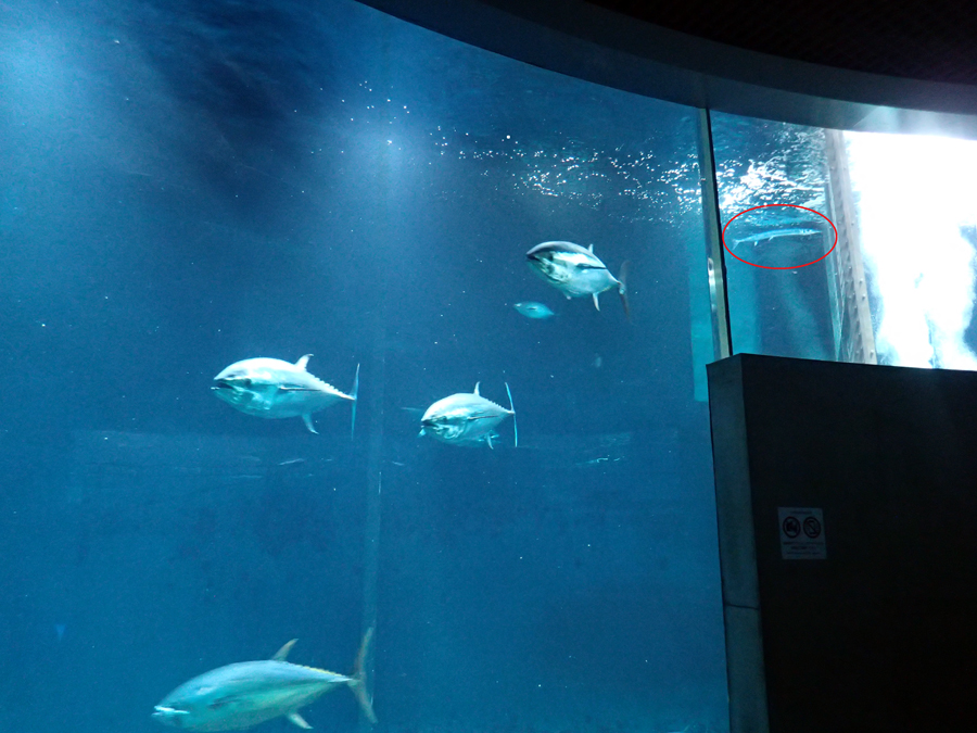 | アクアシアターに侵入したオキザヨリ(赤丸内) | 愛嬌のあるコワモテ顔? |