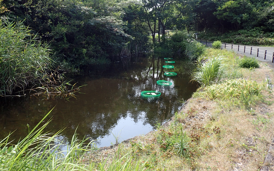 特設展の開催に合わせて水元公園サービスセンターから保存していた種を譲り受け、展示にチャレンジすることにしました。まずは冷蔵されていた種を常温に戻して発芽させ、発芽した種を予備の水槽で大切に育てました。その後、手のひらサイズの葉が数枚出てきた7月中旬、「流れ」の淵に移植し展示を始めました。