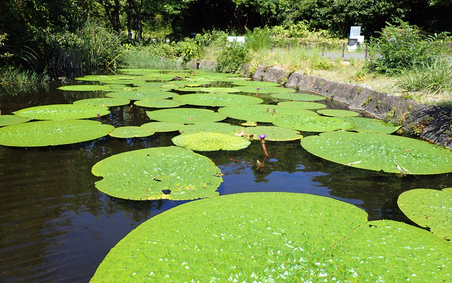 展示開始直後は葉も小さく、オニバスとは思えない弱々しい小さな姿でした。アメリカザリガニによる葉の食害が心配されたため、葉のまわりにカバーをかけてしばらくようすを見ていましたが、環境がよかったためか順調に生育し、移植後1か月で葉の大きさが直径1メートルを超えるほどに成長しました。その後、紫色のきれいな花も咲き、現在見ごろを迎えています。8月27日に測ると、葉の大きさは直径175センチに成長していました。