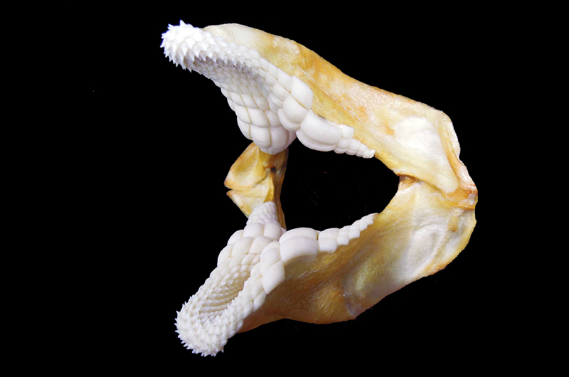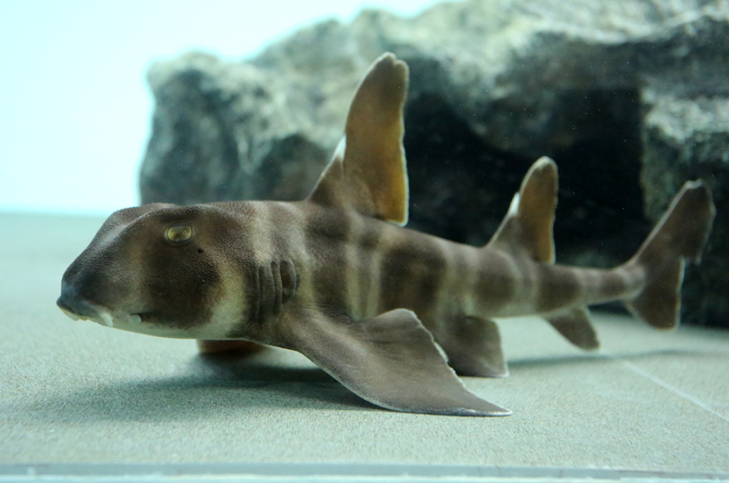 たとえば、サメの歯と聞くと三角形のギザギザした形を思い浮かべるかもしれません。水槽のネコザメも口からのぞく小さなギザギザした歯が見えるかもしれません。でもじつは、ネコザメの奥にある歯は平らな形をしているのです。