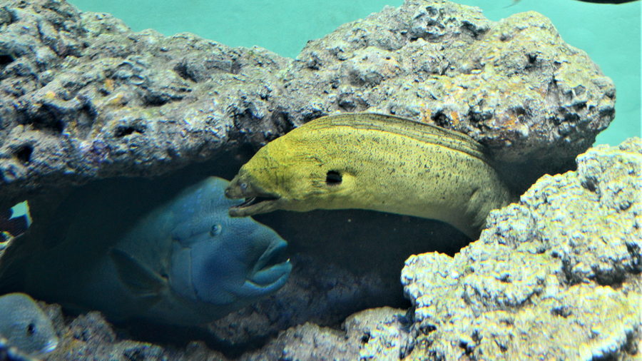 出入口を小さくした結果、小さい魚たちがときどき擬岩に出入りしてじょうずに利用しています。ドクウツボもいやがるようすは見せず、擬岩の外の隙間に落ち着いています。今回の改良によって魚たちは安心して過ごせるようになったようです。