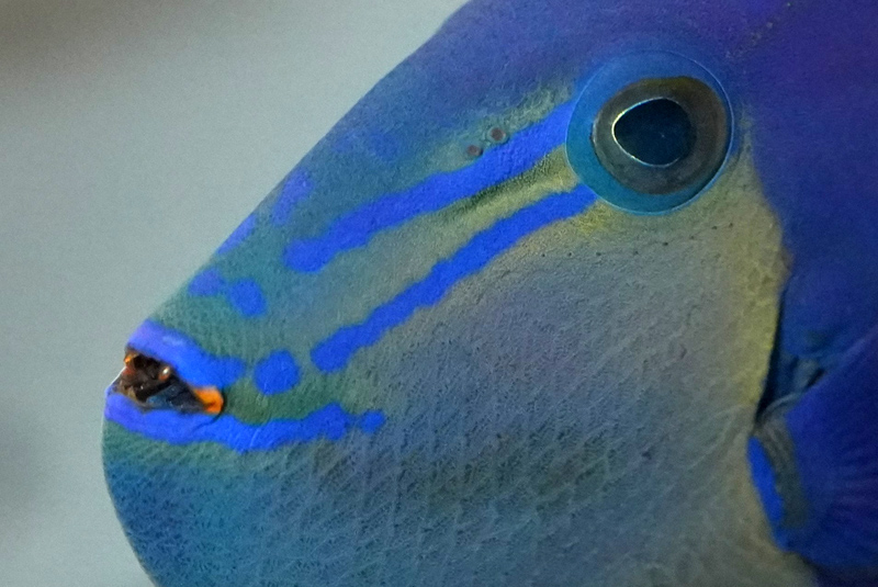 正解はなんと、歯が赤いのです。先が尖った円錐形の歯は、特に上あごの2本が成長につれて長く伸び、赤い牙のようにも見えます。英語ではその見た目からRedtoothed triggerfish(赤い歯のモンガラカワハギ)と呼ばれます。実は日本でもかつては「アカハ(歯)モンガラ」と呼ばれていたのが、いつの間にか「ハ」が抜け落ち、アカモンガラになってしまったという説もあります。