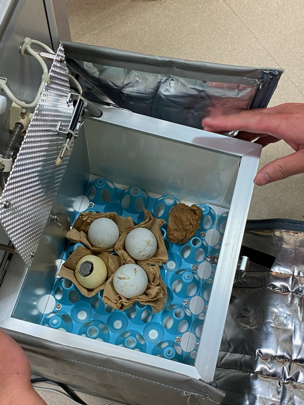 輸送した卵 (左下は記録機器を装着した擬卵) | 長崎ペンギン水族館に搬入した受精卵3卵 (写真提供:長崎ペンギン水族館) |
