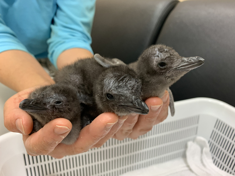 2021年6月9日に孵化した1羽目のひな 孵化時の体重:40.0g (写真提供:長崎ペンギン水族館) | 元気に成長している3羽のひな 左から6月13日生まれ、9日生まれ、10日生まれ (写真提供:長崎ペンギン水族館) |