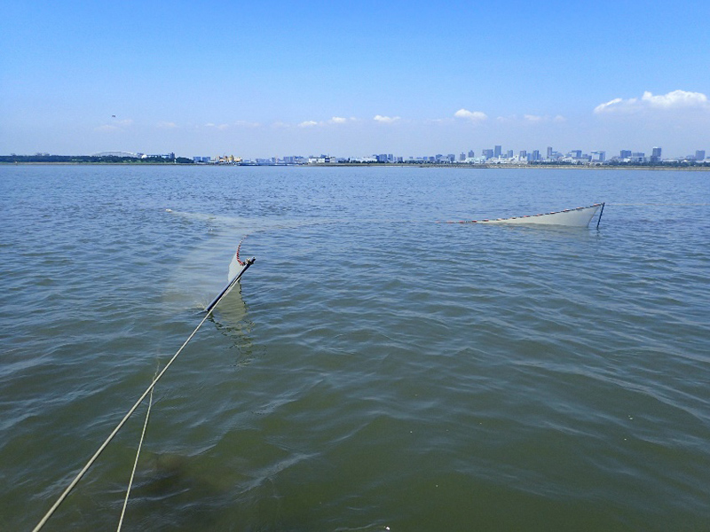 調査結果は「東京の海」エリアの「葛西の海 2」水槽で掲示しており、水槽では調査時に採集された生き物の一部を展示しています。8月24日におこなった調査では、ギマやマゴチなどの稚魚が採集できました。おそらく6〜7月ごろ生まれたこれらの卵や稚魚が「西なぎさ」へ流され、成長しているのでしょう。「西なぎさ」は浅く、大型の魚が入りにくいため、小さな魚が成長するにはとてもいい環境なのです。今回の調査で採集した生き物は、9月初旬から展示予定です。