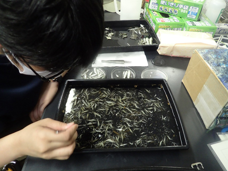 小さな稚魚も詳しく種類を調べます