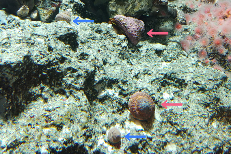 「カナダ西岸」水槽では、レッドターバンスネイル、ブルートップスネイルという2種の巻貝を展示しています。