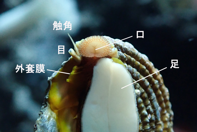 次は、頭の方を見てみましょう。2本の触角が見えます。触角の付け根には目があるのですが、外套膜や殻に隠れていて見にくいかもしれません。そして触角の少し手前で開いたり、閉じたりしている穴が口です。口の奥からせり出してきてガラス表面をなめているのは、歯舌という貝の歯。細かい歯がたくさん並んだ、おろし金でできたベルトのような構造になっていて、岩の表面についた藻類などを削り取って食べます。