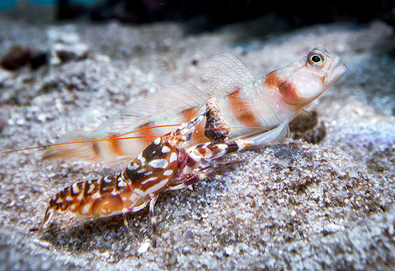 葛西臨海水族園の「東京の海」エリアの「伊豆七島の海3」水槽では、ニシキテッポウエビと共生しているダテハゼを展示しています。ダテハゼはニシキテッポウエビが作った巣穴を使わせてもらうかわりに、周囲を見張って危険が迫るとニシキテッポウエビに伝える、というふうに役割分担をしてくらしています。