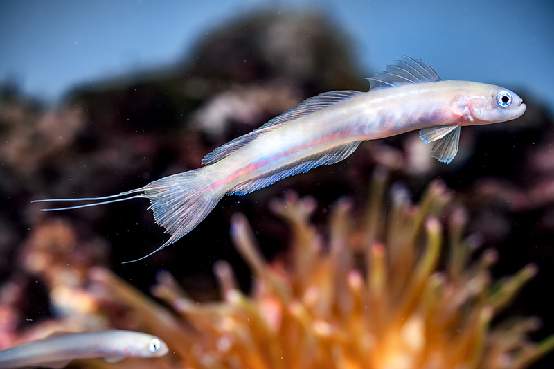 ダテハゼがいる水槽では、テッポウエビ類と共生しないとされるハナハゼもいっしょに展示しているのですが、あるとき不思議な光景を目撃しました。なんとハナハゼがニシキテッポウエビの巣穴に入っていったのです。しかもハナハゼが巣穴に入ったことに対して、ダテハゼは無反応。
