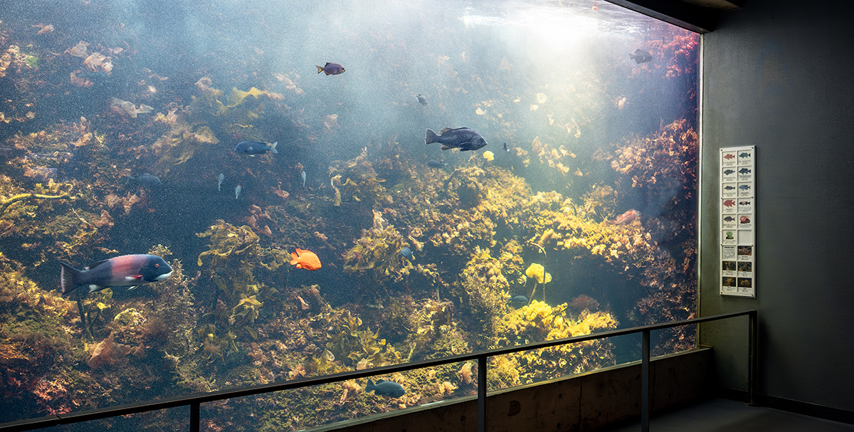 現在「海藻の林」水槽では、新水族園に向けて試験的に日本産海藻類を育てながら、カリフォルニア沿岸の魚類や無脊椎動物の飼育を展示していますが、整備後の魚類や無脊椎動物は日本産に変更します。なお、現在展示しているカリフォルニア沿岸の魚類の一部は別の水槽で展示を予定しています。