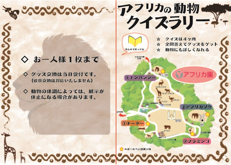 春の花も咲き始める暖かな季節が近づきました。2016年の春は、アフリカの動物を巡るクイズラリーを実施します。アフリカにすむ動物たちを観察しながら園内を巡り、クイズに答えましょう。ゴールした方には、オリジナルグッズを差し上げます。