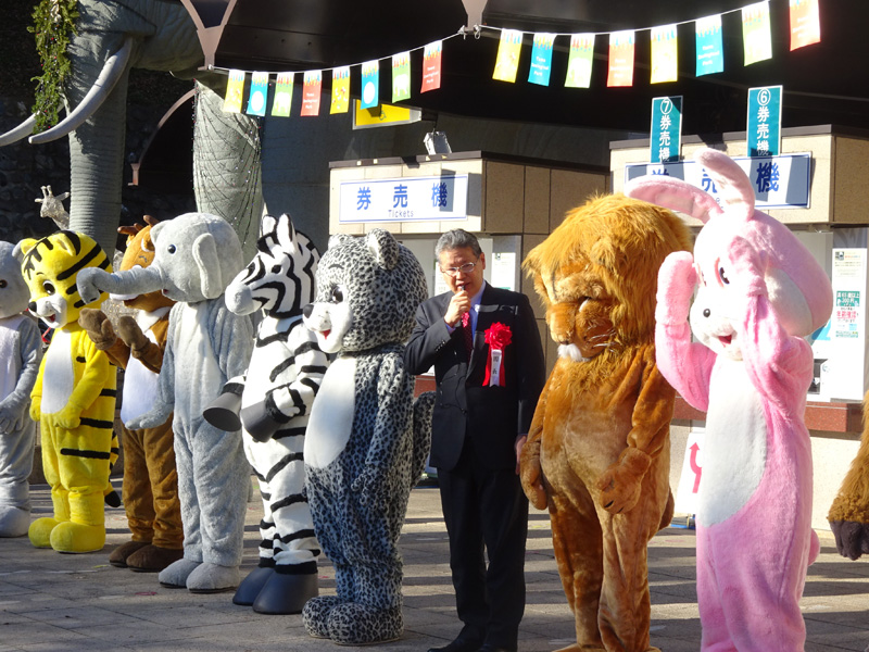 園長が新年のごあいさつをするとともに、着ぐるみの動物たちがご来園の皆様をお出迎えします!