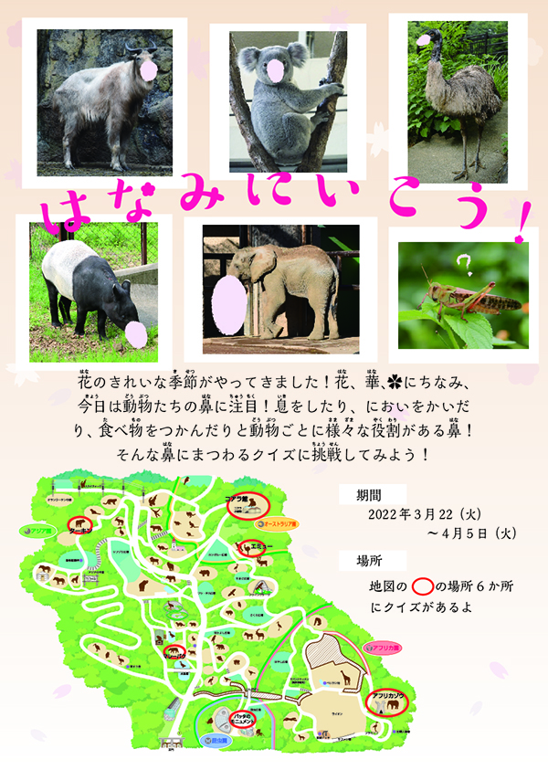 こんな時期には、動物園ならではの「はなみ」はいかがでしょうか? 動物の鼻を見る「はなみ」をしながらクイズに挑戦し、動物たちの鼻のふしぎにせまってみましょう!