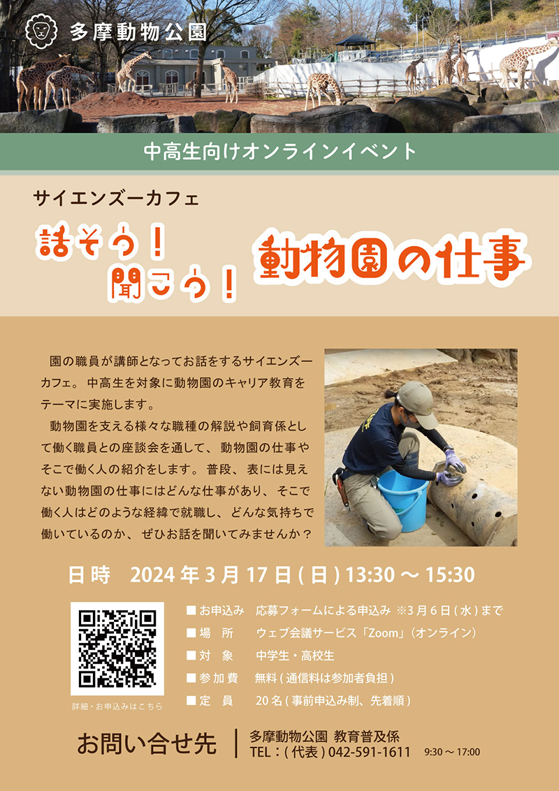 3/17 中高生向けオンラインプログラム「サイエンズーカフェ」開催!『話そう!聞こう!動物園の仕事』参加者募集中!(※募集終了しました)