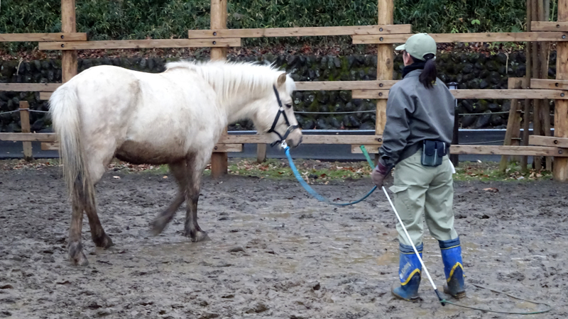 さて、そんな元気な2頭ですが、来園者と接するためのトレーニングを積んでいるところです。家畜馬である北海道和種は、古くから人と生活をともにしてきた馬です。畑仕事をしたり、荷物を運んだりするため、人の指示に従って動くよう、トレーニングをおこないます。