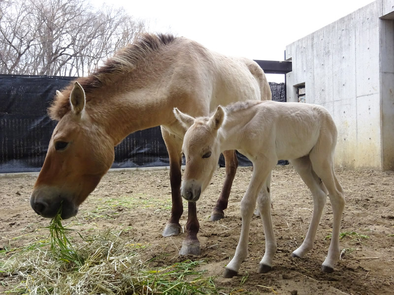 3組の親子は、「アジアの平原」モウコノウマ舎展示場の一部で、体調を見ながら群れ入りの練習を始めており、4月14日現在、パーニャ親子をフェンス越しにご覧いただけます。